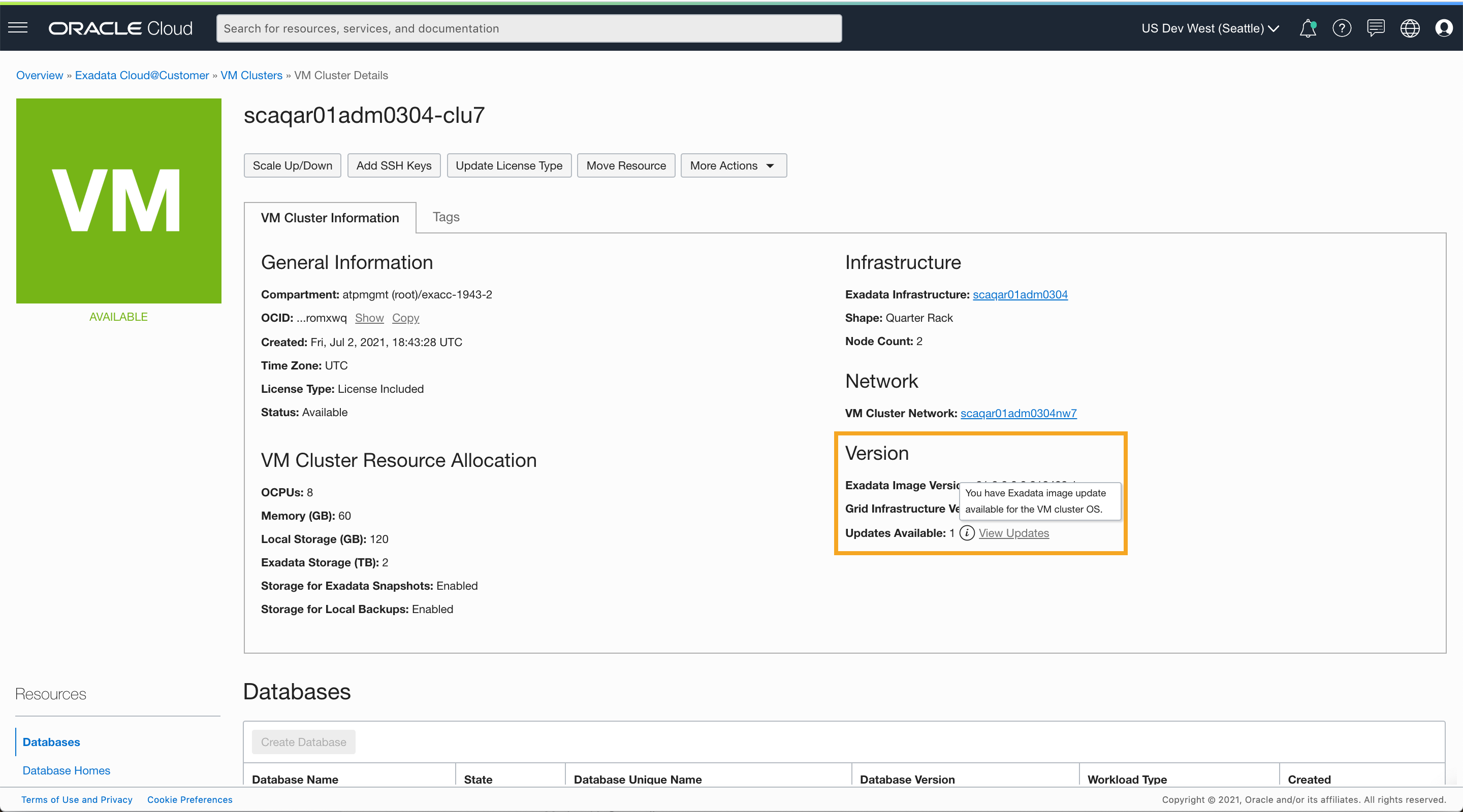 The VM cluster details now include the Exadata Image version running on the VMs in the cluster. Based on the software version running on the various components in the VM Cluster, we have a counter indicating the pending software updates available to apply. The tooltip for the available updates count shows the specific VM Cluster components with a pending software update. You can view these available updates using the View Updates link and go to the software updates management page built for this VM Cluster.