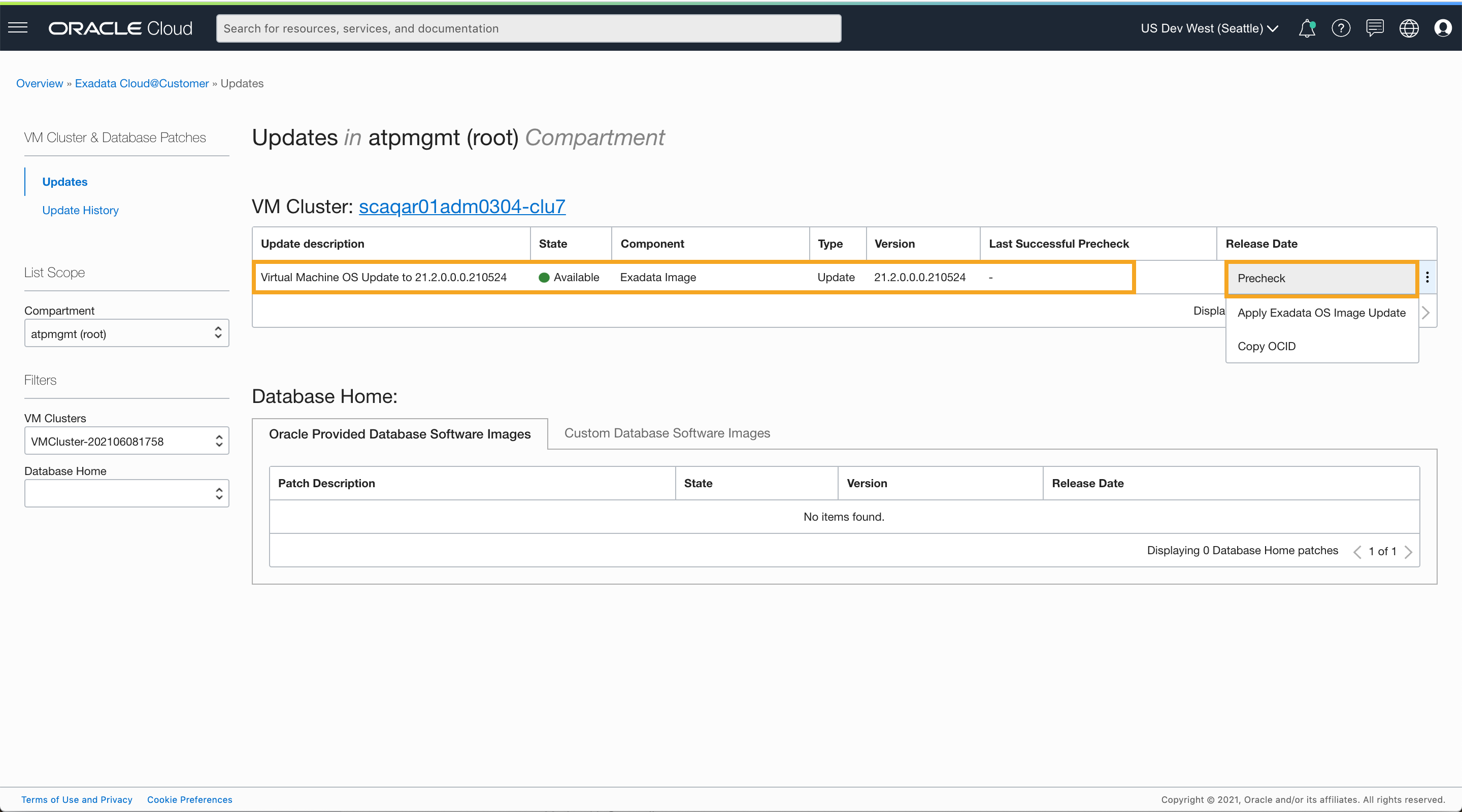 The software updates management page lists all the applicable updates available for the specific components in the VM Cluster. If the cluster is not running the latest Exadata Image, you will see the latest version listed here. Oracle recommends running a precheck with the software update version you want to apply to the VM Cluster. Running a precheck will help you plan the update and address any compatibility issues with the new software version ahead of time. Each software update now includes the last successful precheck timestamp to help plan your update. Running a precheck does not affect the availability of the databases running on the VMs in the cluster.