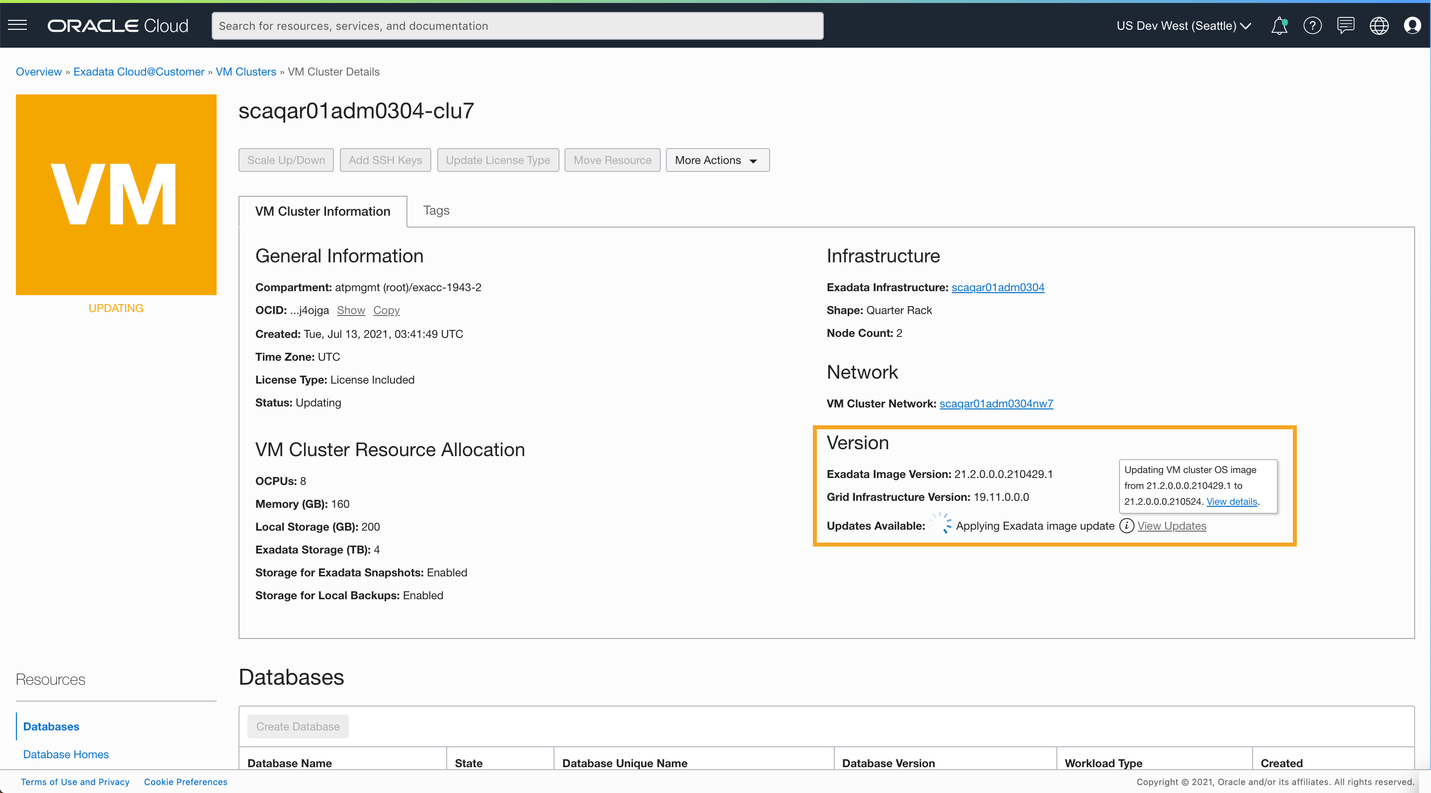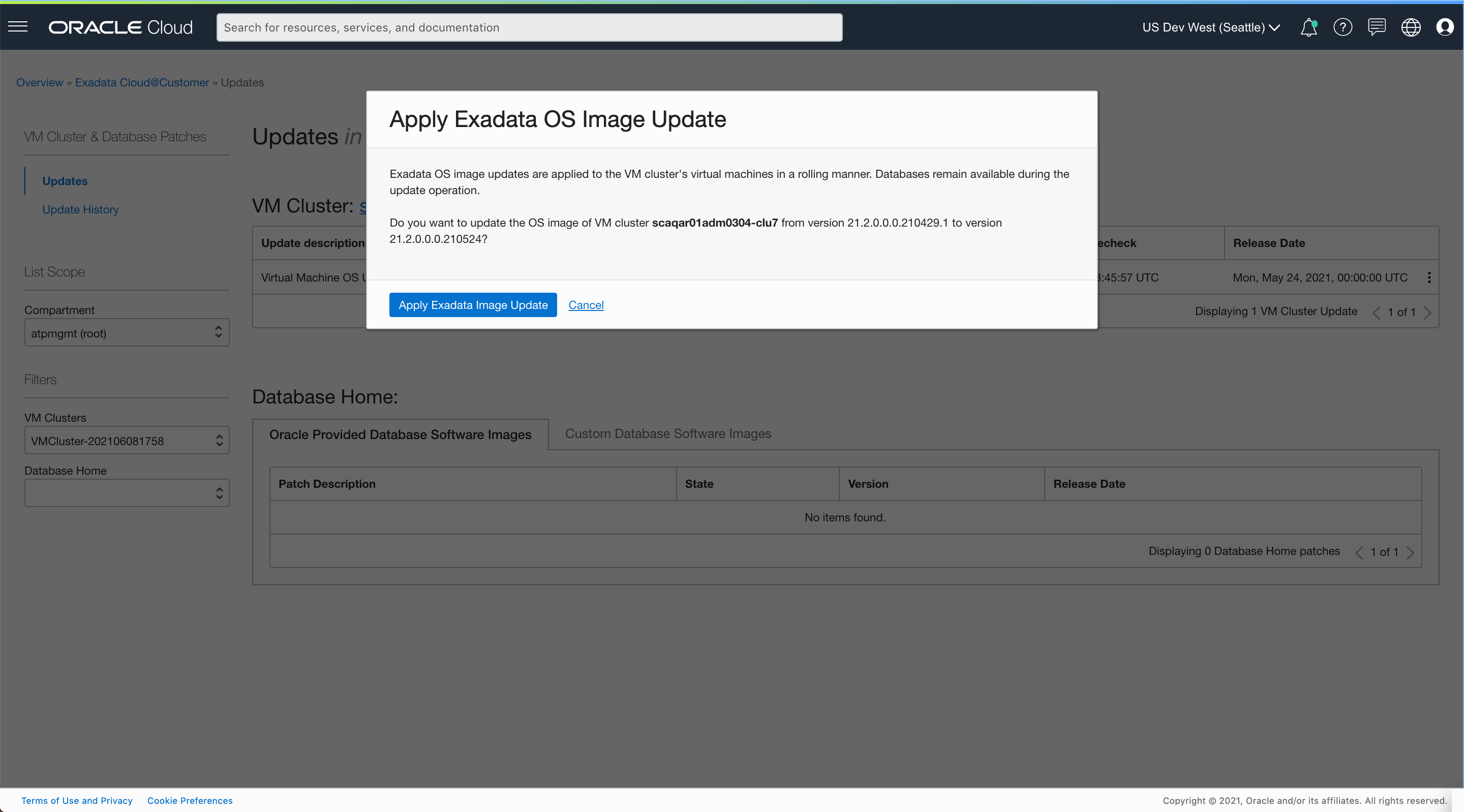 Note: Once the VM cluster has the latest Exadata OS image, the cluster will not have any OS software updates available to apply. The VM cluster details will show the latest Exadata Image version and the pending updates counter will be reset until Oracle publishes a new Exadata OS Image. If the latest Exadata OS image version fails to apply, you have the option to roll back the update and revert the OS image to the prior version.