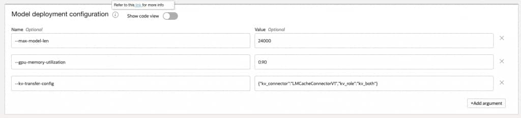 - Under Show Advanced Options, add the following to the Model deployment configuration. Ensure that there are no spaces in the value provided for they kv-transfer-config key.