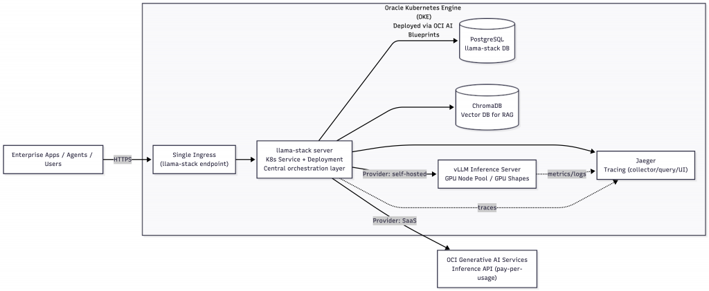In partnership with the Llama Stack team at Meta, we created a Llama Stack blueprint that deploys a complete, resilient service architecture: PostgreSQL as the Llama Stack DB, ChromaDB for vector search in RAG, Jaeger for tracing, vLLM on GPU shapes for LLM inference, and the llama stack server to unify these providers into a seamlessly integrated system. For customers who prefer SaaS-only consumption models, we also integrated OCI Generative AI Services directly as providers in Llama Stack —removing the need to deploy and operate GPUs while enabling pay-per-usage model consumption.