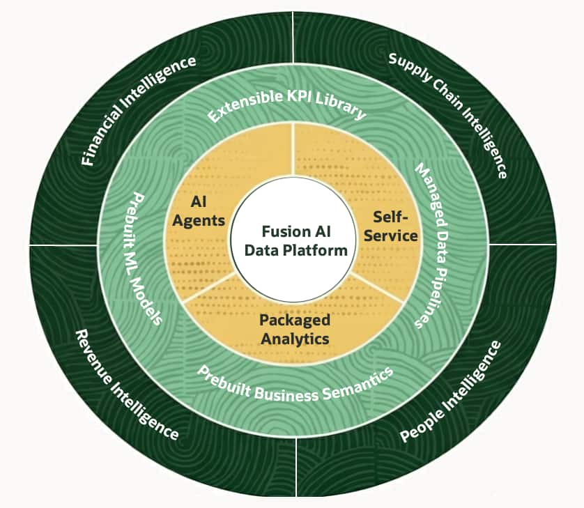 Fusion AI Data Platform is purpose-built for Oracle Fusion Applications. It delivers prebuilt ML models, packaged analytics, and intelligent agents across finance, HR, supply chain, and revenue, built on a trusted data foundation with enterprise-grade security and compliance. Users explore insights through dashboards and conversational AI agents and can trigger decisions that flow directly back into business systems. The platform delivers measurable outcomes across key business roles, for example: