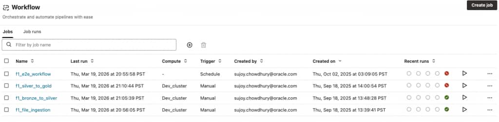 As workflows scale, visibility into execution becomes increasingly important. AI Data Platform Workbench provides a centralized at-a-glance view of job history. This enables teams to track past executions, monitor performance trends, and identify recurring issues. Recurring failures may be a lagging indicator of issues in the notebook code, or some regression.