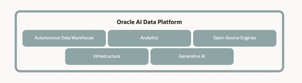 Oracle AI Data Platform brings together data, analytics, and AI in a single, governed environment. It unifies the entire data-to-AI lifecycle—from ingestion and preparation to model development and deployment—on a secure, scalable foundation. With integrated services like Autonomous AI Database, Oracle Analytics Cloud, Apache Spark and OCI Generative AI, AI Data Platform helps teams prepare, govern, and apply AI to their data efficiently. Whether you’re engineering data, developing models, or building intelligent applications, AI Data Platform provides the speed, governance, and integration needed to operationalize AI across the enterprise. In this blog, you’ll learn about what’s included in AI Data Platform and the purpose of each component in the platform.