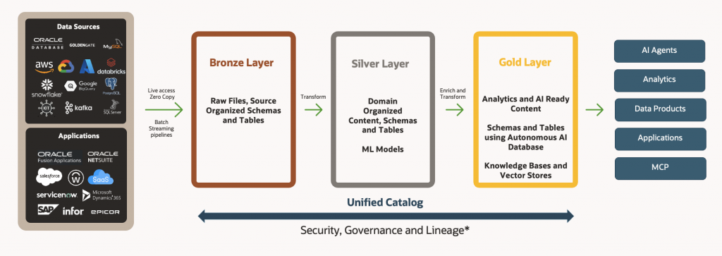 AI Data Platform operationalizes the full data-to-AI lifecycle on a single, governed foundation. With a medallion architecture—refining raw data in bronze, organizing domain assets in silver, and delivering analytics and AI ready content in gold—teams gain a consistent path from ingestion to intelligence. The Unified Catalog, lakehouse storage, Autonomous AI Database, Spark, OCI Generative AI, Analytics Cloud, and workflow orchestration all work together to streamline how data is prepared, enriched, secured, and activated. Whether building data products, developing models, or delivering AI-powered insights, practitioners can move from prototype to production with confidence, repeatability, and governance built in.