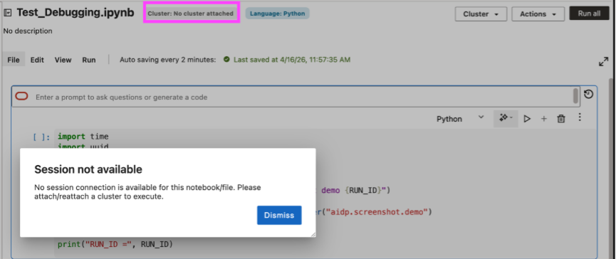 Sometimes the code is still intact on the screen, but the execution environment behind it is no longer available. A notebook can lose its session simply because the attached cluster hit its idle timeout.