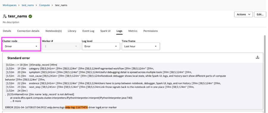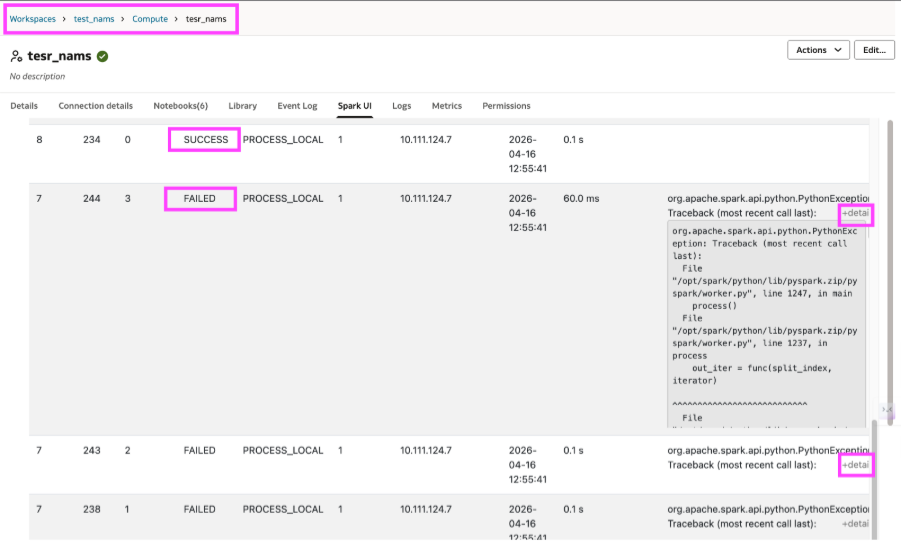 Spark UI and logs become essential at this stage. With AIDP Workbench, it is possible to move directly from the notebook to Spark UI and to driver or worker logs. Spark UI shows which tasks failed, which succeeded, and where the execution broke. Logs help you go one level deeper by showing the driver-side or worker-side error that caused the failure.