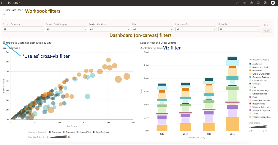 Oracle Analytics provides the ability to apply filters at the Workbook, Canvas, and Visualization scope. In this example, the dashboard author added multiple filter scopes for end-user interaction.