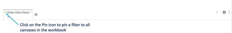 - When a filter is pinned, the filter is available on all canvases in the workbook.