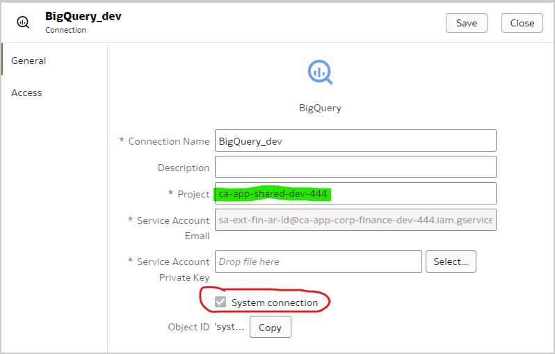 - In OAC, inspect the Big Query connection and copy the Object ID. Big Query is case-sensitive. To ensure that the data connection syntax is correct, use the Copy button.