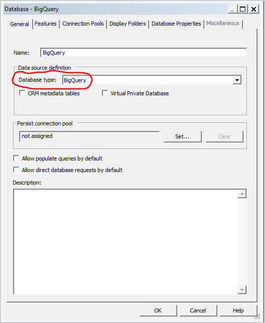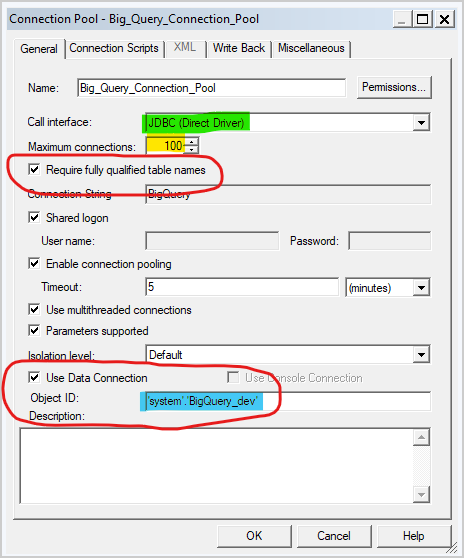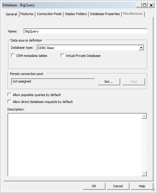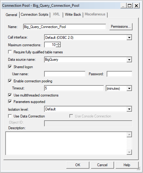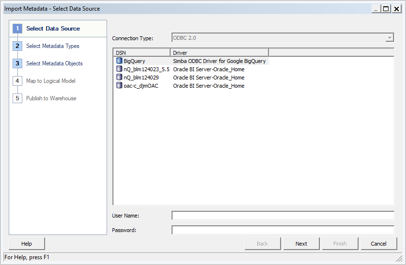 - In the Data source name field, select the Big Query ODBC driver that was created earlier.