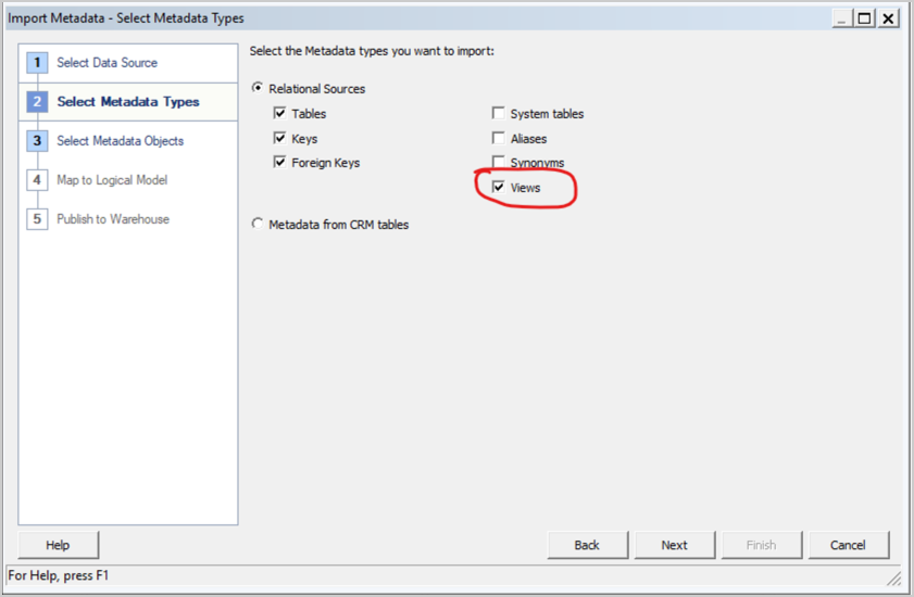 - In this case, the Big Query key has permissions only on views. Select Views on the Select Metadata Types screen.
