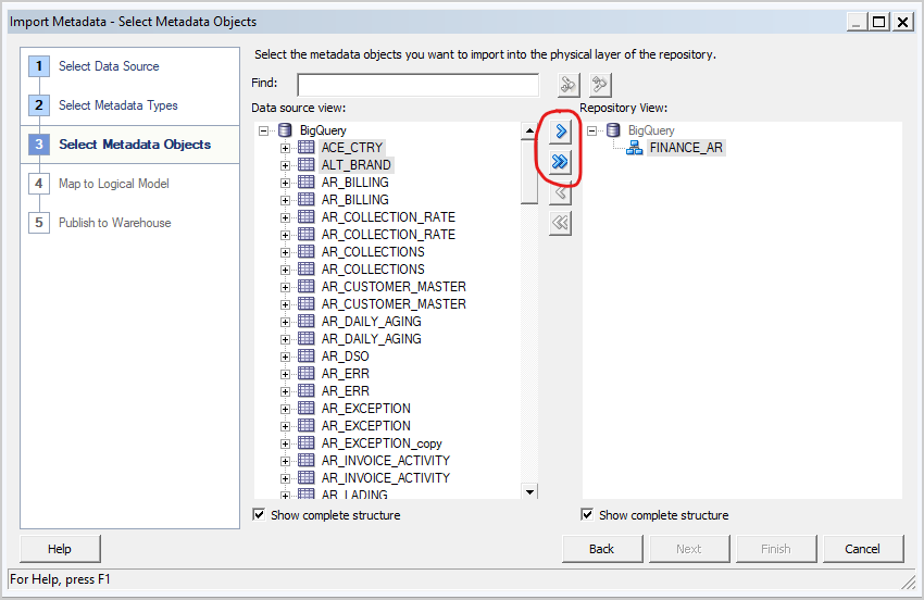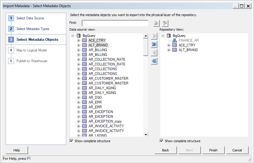 - On the Select Metadata Objects screen, select the individual tables and then click Import Selected. This imports the Big Query database and the underlying structures.