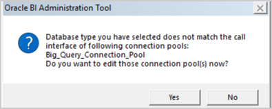 - When changing the physical database, you see a message that states that the database type doesn’t match the call interface set in the connection pool. Edit the connection pool in the next step.
