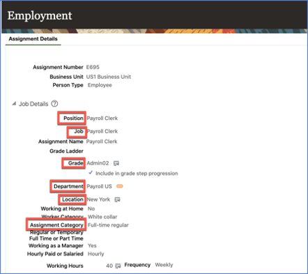 These essential employment attributes must be populated in Oracle Cloud HCM: Assignment Category and these Work structure attributes (Grade, Location, Department, Job, Position). Leaving these attributes blank in the application causes related measures in Oracle Fusion HCM Analytics to return either incorrect, inconsistent, or blank values.