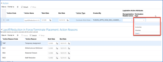 All termination action codes should be mapped to either voluntary or involuntary termination type. Without this configuration in Oracle Cloud HCM, the voluntary and involuntary termination measures in Oracle Fusion HCM Analytics render incorrect numbers. For example, the predefined termination actions of Death and Reduction in Force are categorized as voluntary and involuntary respectively. Ensure that any custom termination action is associated with a termination type (either voluntary or involuntary) to help categorize the termination in Oracle Fusion HCM Analytics.