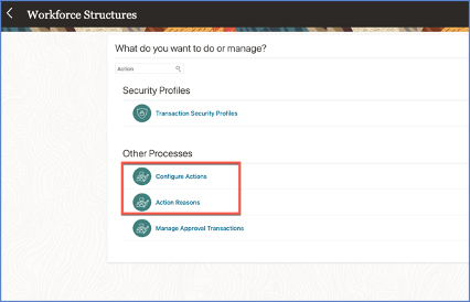 Actions track changes to HCM records, such as employment and assignment records. When you create or update these records, the action identifies the cause of the record creation or change. For analysis and reporting purposes, ensure that the action framework is implemented correctly, such as associating action reasons to actions and so on.