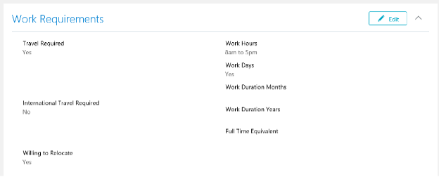 The job applicant’s profile attributes are available in the HCM – Talent Acquisition subject area in the Job Application – Degree, Job Application – Certification, Job Application – Work Requirement, and Job Application – Previous Employment subfolders. To use the measures related to work requirements, configure the Talent profile related blocks in Oracle Cloud HCM to collect information from job applicants.