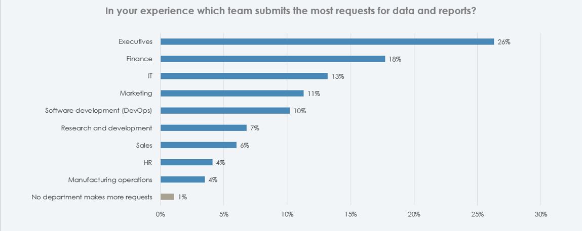 Executives represent the largest source of requests for KPIs to support business analysis and decision-making. Finance is second.