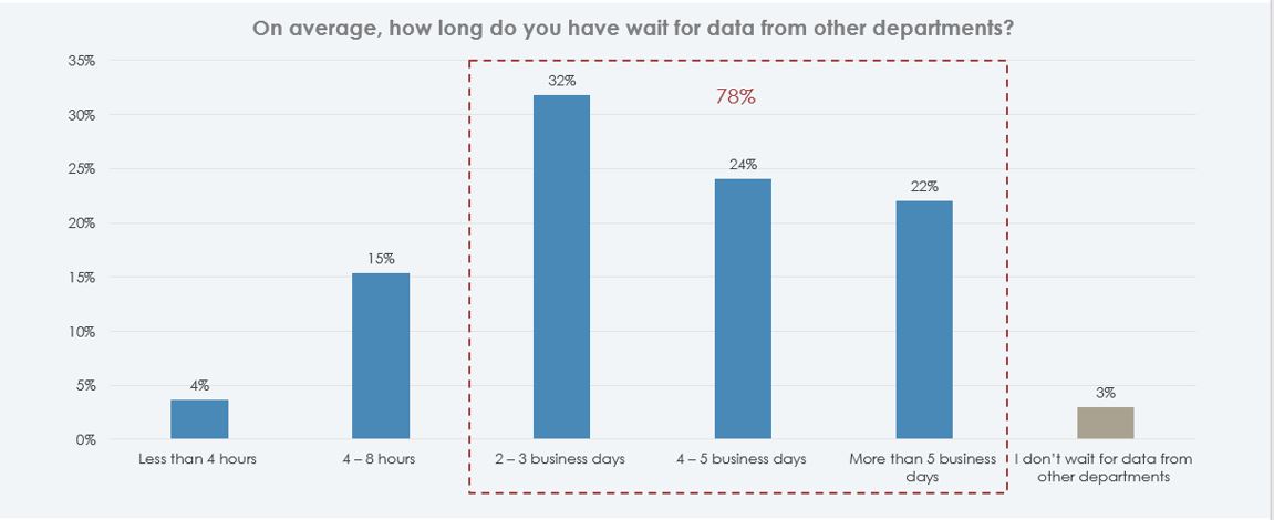 78% must wait two or more days to receive needed data. Over 75% of respondents reported a delay of at least two days waiting for needed data from other departments, with almost half (46%) claiming four or more business days.