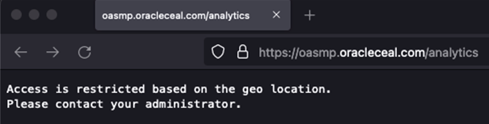 - Scenario 1: A user tries to access the Oracle Analytics Server from a location other than the US. In this scenario, the action rule you configured restricts the application’s access and displays a message.