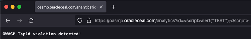 - Scenario 2: A user tries to access the protected Oracle Analytics Server endpoint from within the US with a Cross-Site Scripting (XSS) attempt enabled. In this scenario, the protection rules you defined automatically detects the traffic and blocks the request and presents the page with a pre-configured message for that rule.