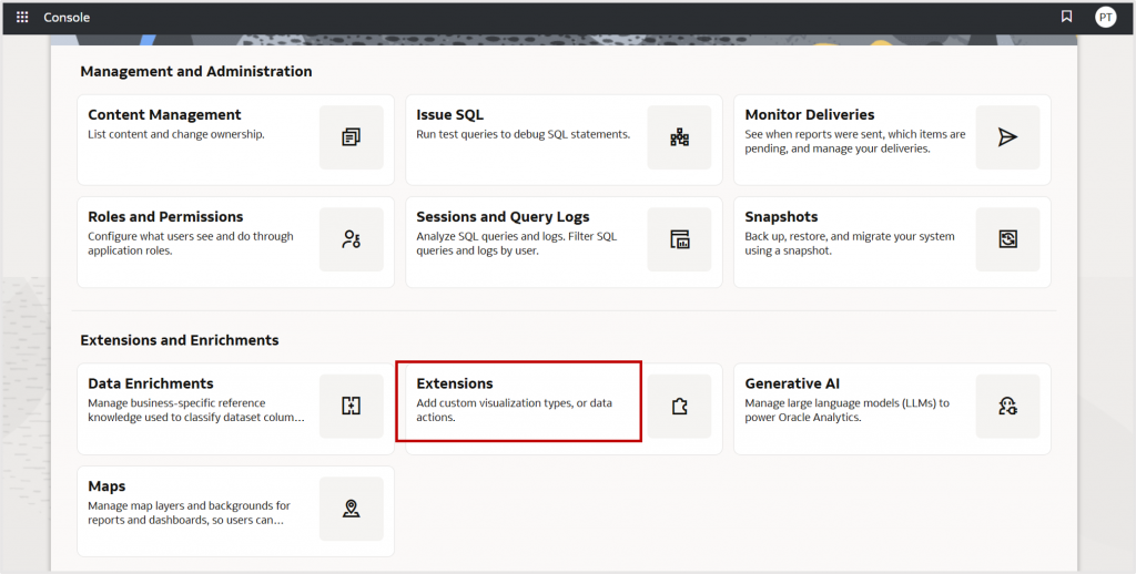 In Oracle Analytics, navigate to Console, and then Extensions, and upload the customviz_com-company-shapebarchart.zip file.