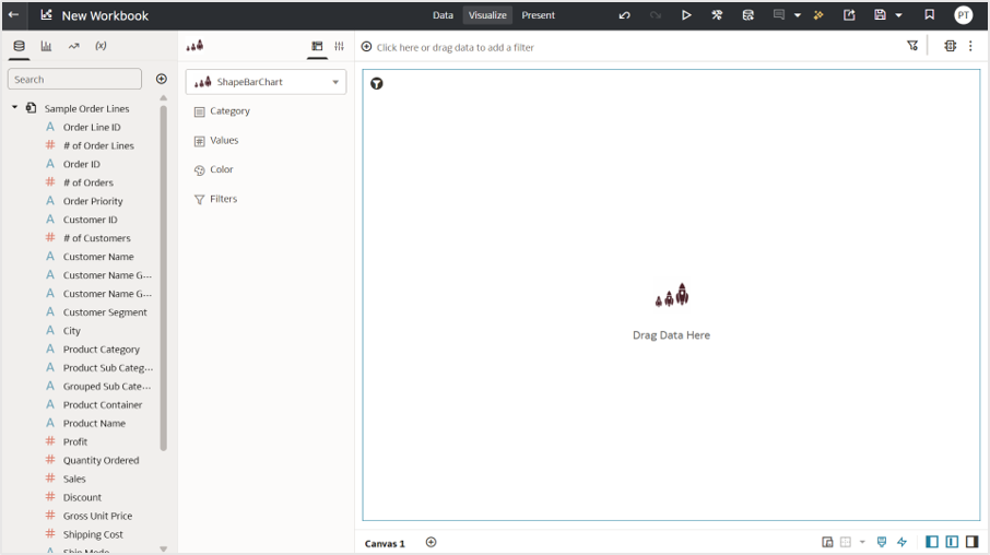 Create a workbook and drag the ShapeBarChart extension to your canvas.