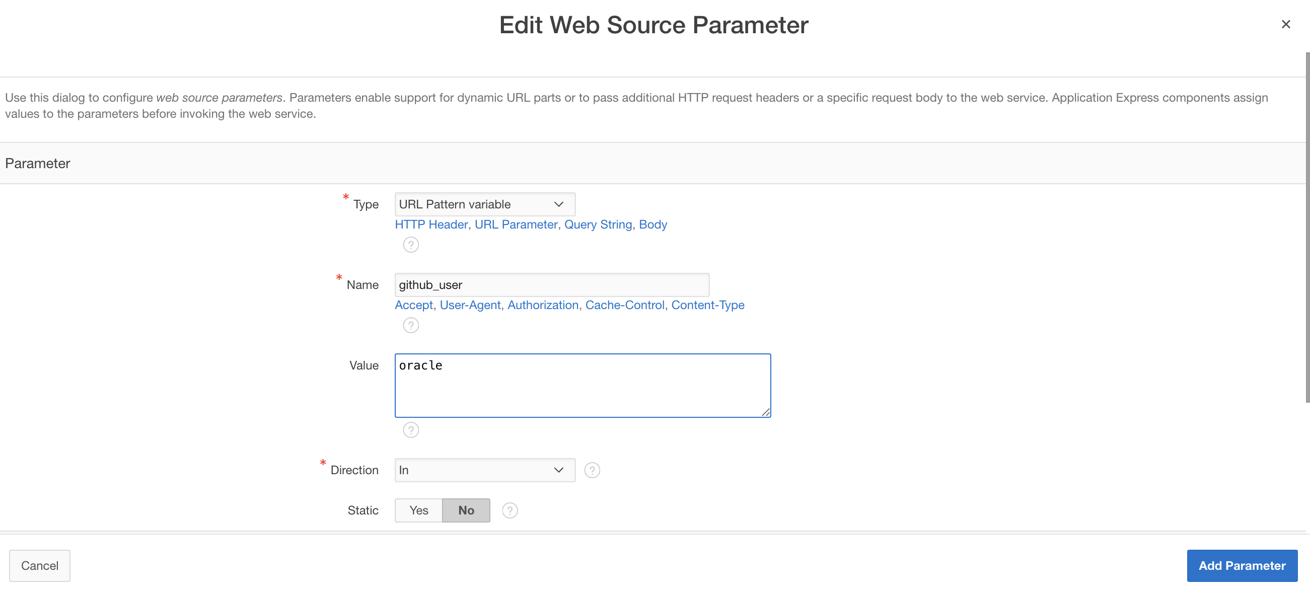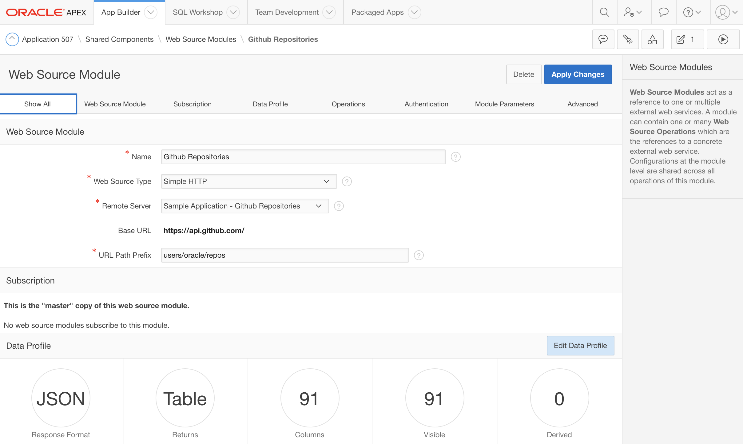 Based on the first example (which will work similar in Early Adopter 2), we’ll today introduce, how to use Web Source Modules within PL/SQL. So, in your Early Adopter Workspace, recreate the Github Repositories Web Source Module, as outlined in the Application Express Early Adopter: REST Services! posting.