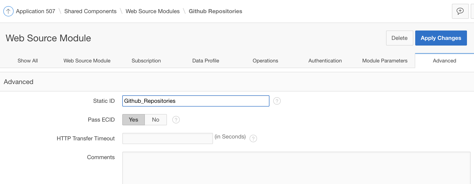 The Github_Repositories identifier will be important, when using this Web Source Module in custom PL/SQL code. Of course, you can always change the Static ID; however, once you have PL/SQL procedures depending on it, this is not advisable any more.