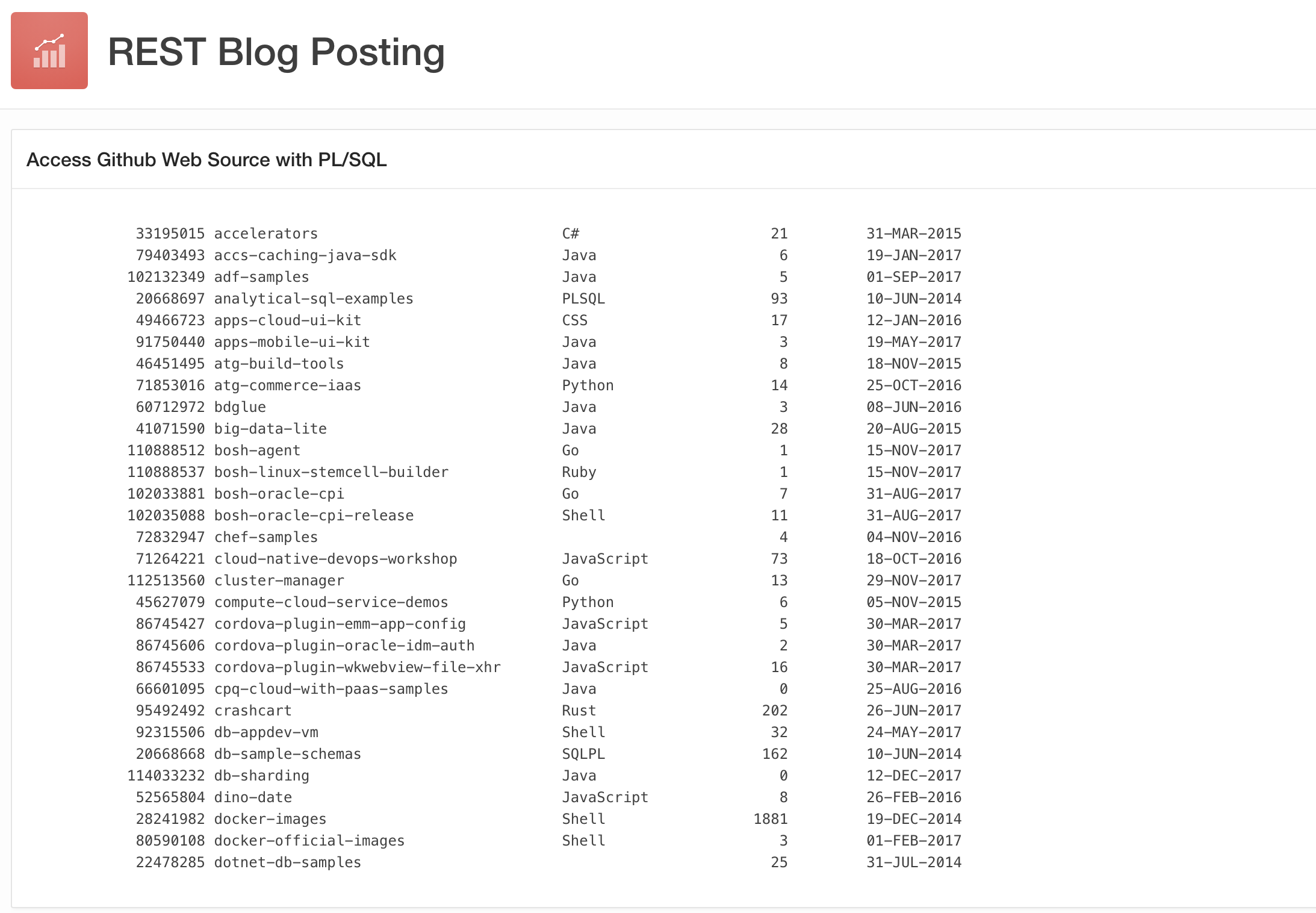 And the cool bit about this is, that we now can access a REST Services with PL/SQL; but we do not have to bother with JSON parsing or correct parameters for APEX_WEB_SERVICE calls. The PL/SQL code deals with the REST service on a high level, while all low-level work is done by Application Express.