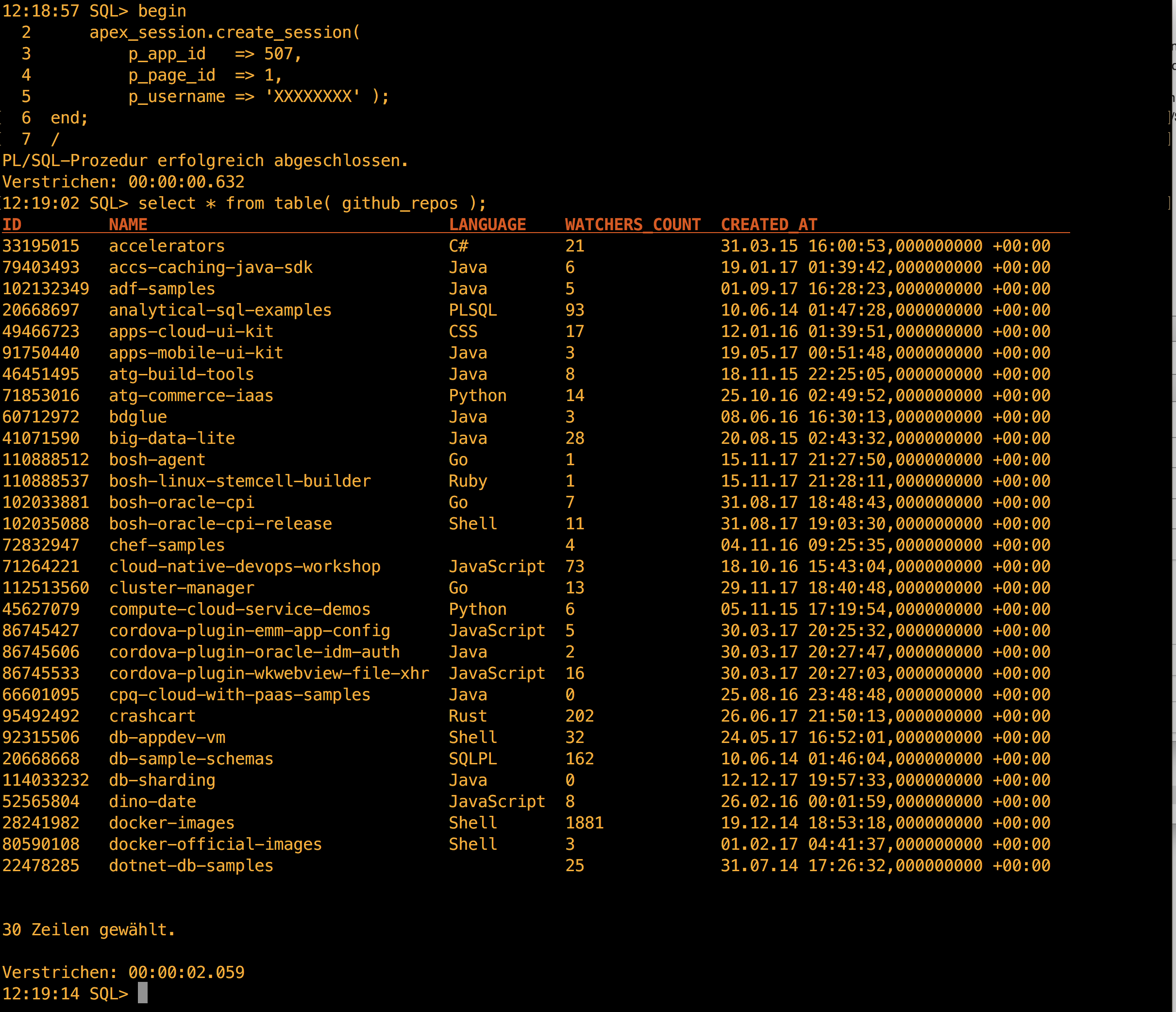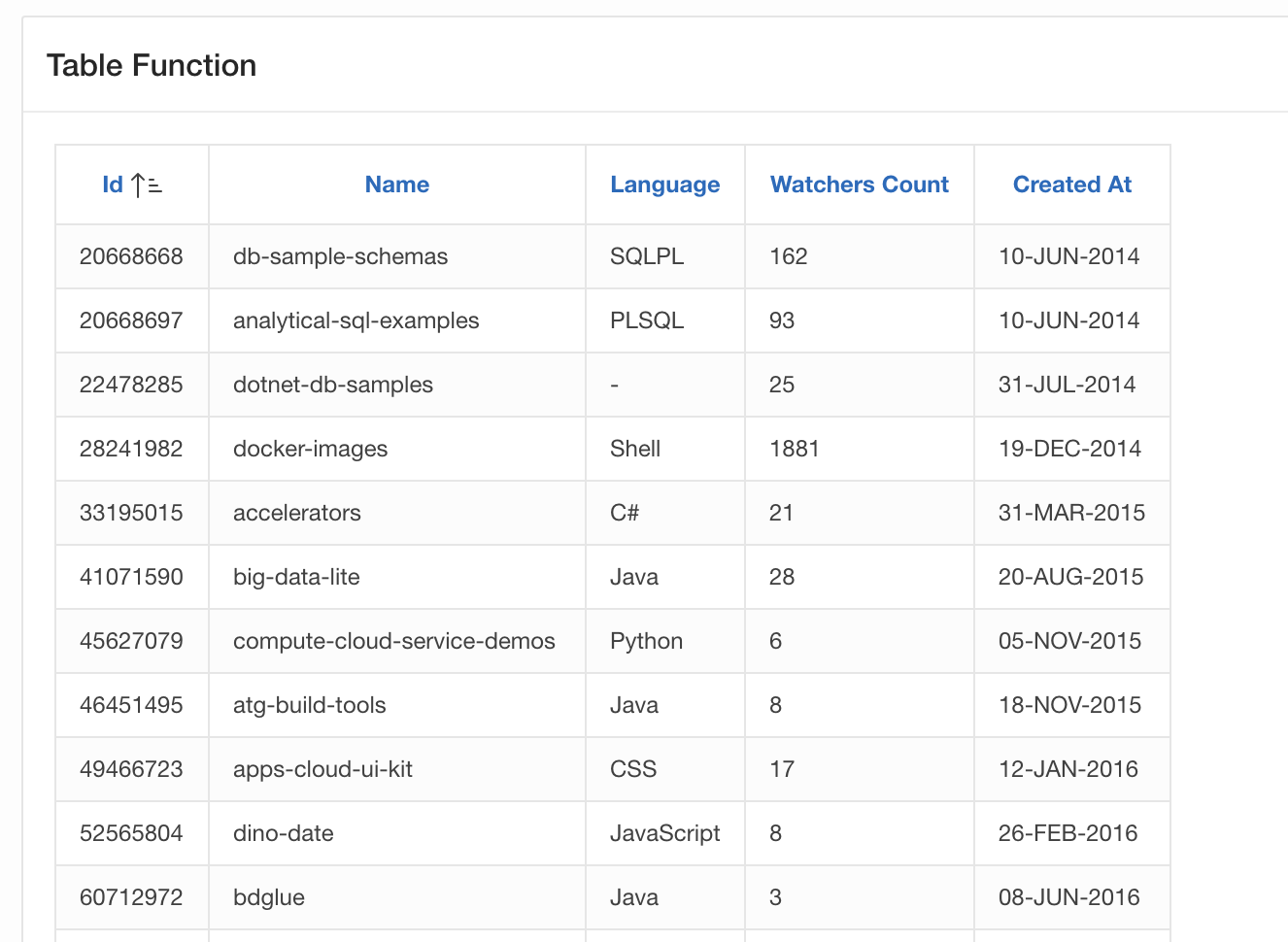 From now on, we can call the table function with a Github username as the parameter – the table function will then return repository information for that very user.