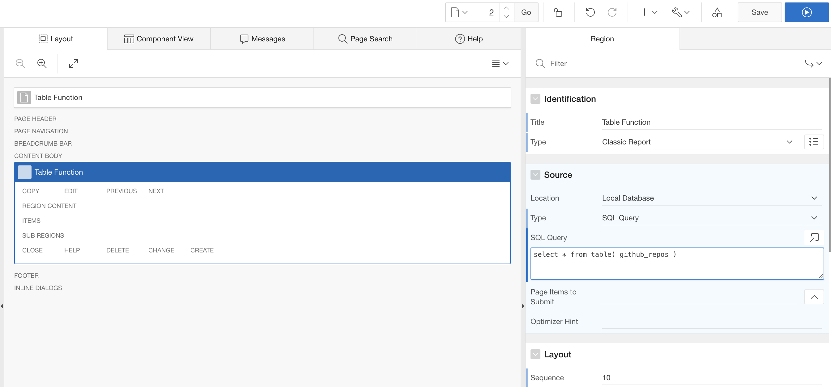 Let’s take that example a bit further. We want to have a PL/SQL table function which can be accessed in Scheduler Jobs and outside of APEX as well. First, let’s implement the table function; the code above covers 85%; we just have to add some boilerplate code for a table function. Run the following code in SQL Workshop; either as a SQL Script or one by one in SQL Commands.