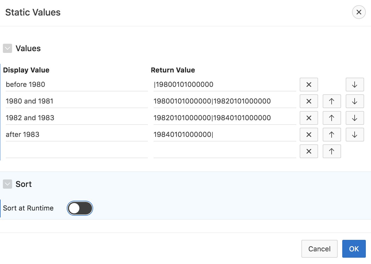 - Provide the LOV values. For DATE columns, use the “canonical date format” of YYYYMMDDHH24MISS. Use the pipe symbol (|) to separate lower from upper boundary. Provide the display value as appropriate. For the HIREDATE column of the EMP table, the LOV definition could look as follows: