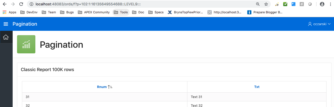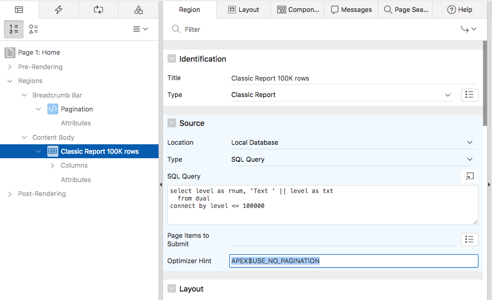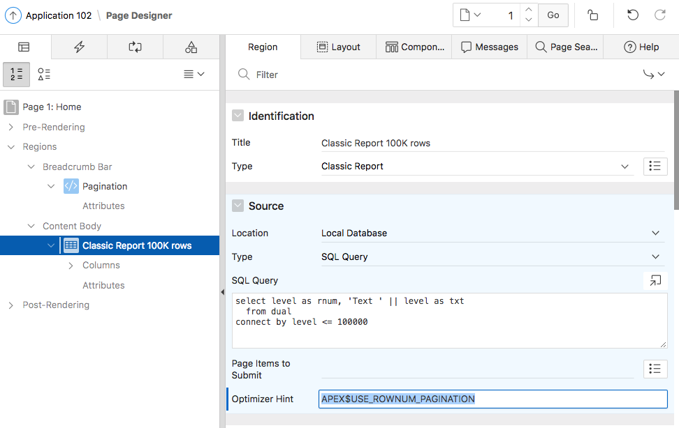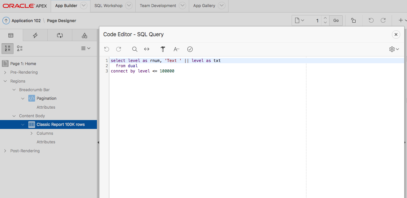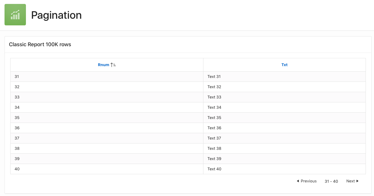 To see the new pagination implementation in action, let’s have a look at a classic report example. Consider a classic report with a SQL query emulating 100,000 rows.