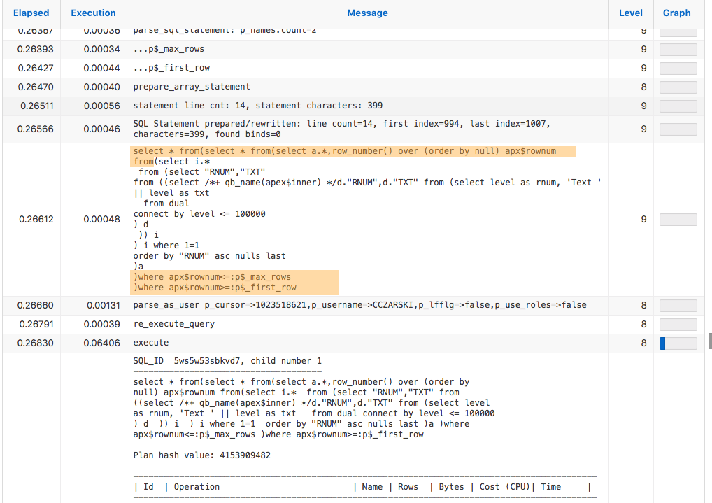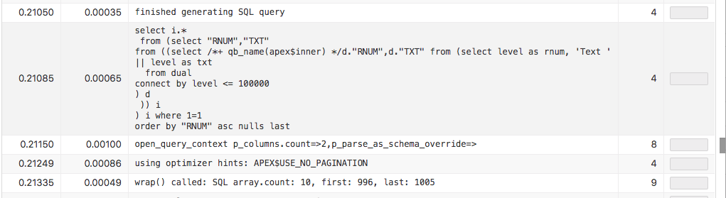 As an interesting side note: Level 9 Debug output will also contain the actual execution plan for the SQL query. APEX retrieves that immediately after execution.