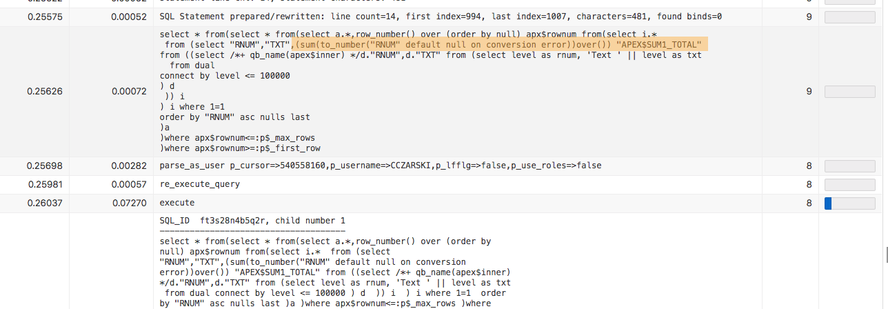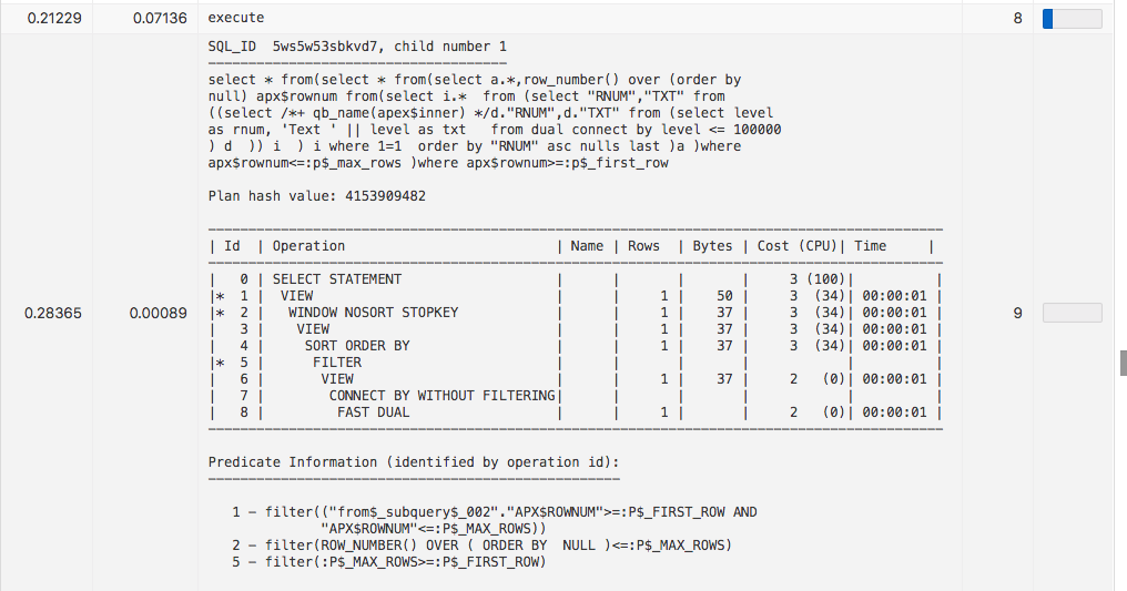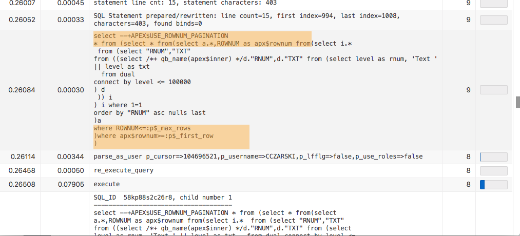 However, cases have been observed (especially with complex SQL queries, selecting from complex views), where the usage of ROW_NUMBER led to bad query execution plans – and the ROWNUM implementation would have been the better choice. The APEX$USE_ROWNUM_PAGINATION pseudo hint helps in these situation. And when the behavior of APEX 5.1 and earlier is the best solution (which was to append no pagination filters at all), the APEX$USE_NO_PAGINATION hint brings exactly that back.