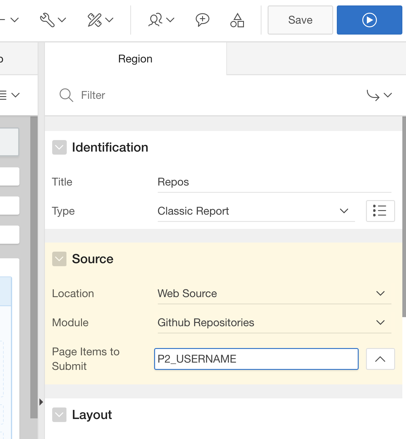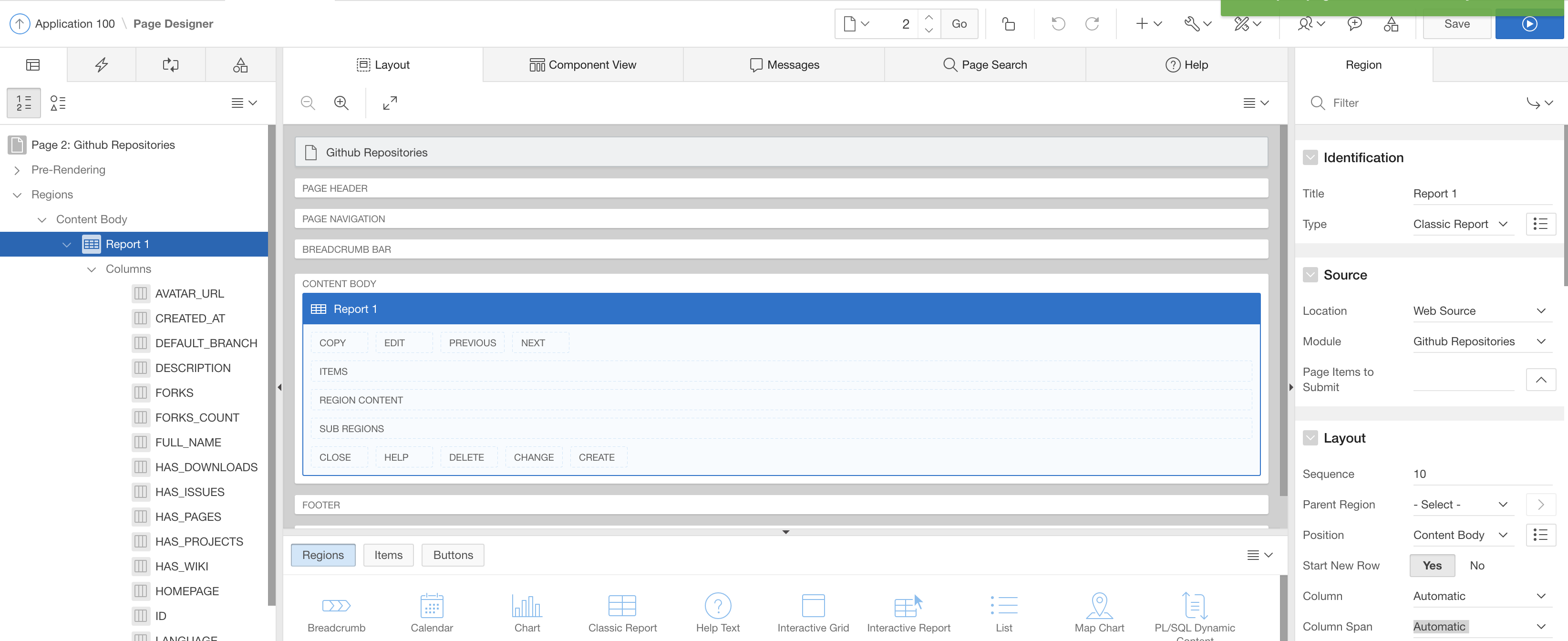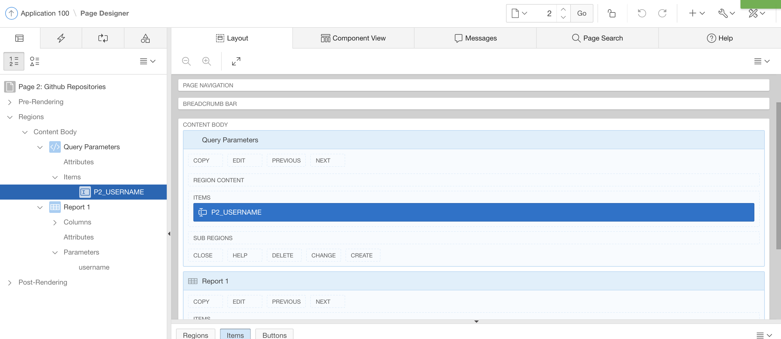 Finally, click the Apply Changes button. Then, head back to your page containing the report. We want to have a text field on the page, where the end user enters a Github user name. Then the report is supposed to refresh with the data for that very user. Thus, in Page Designer, add a new region above the report, add a page item (Text Field) and configure its layout.