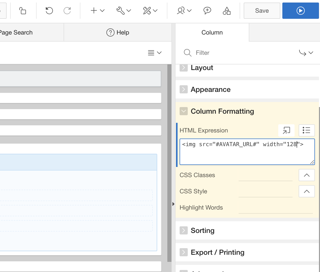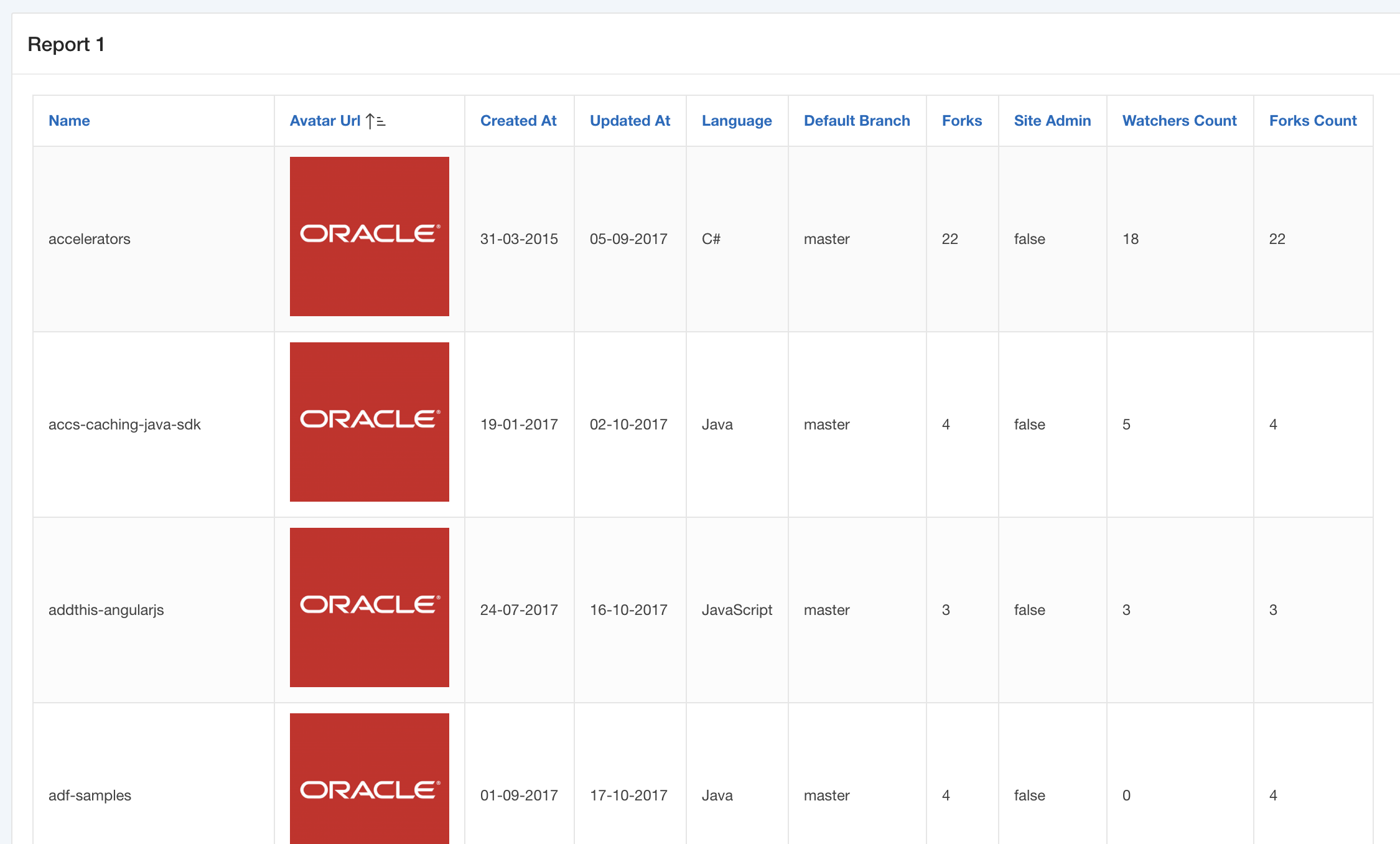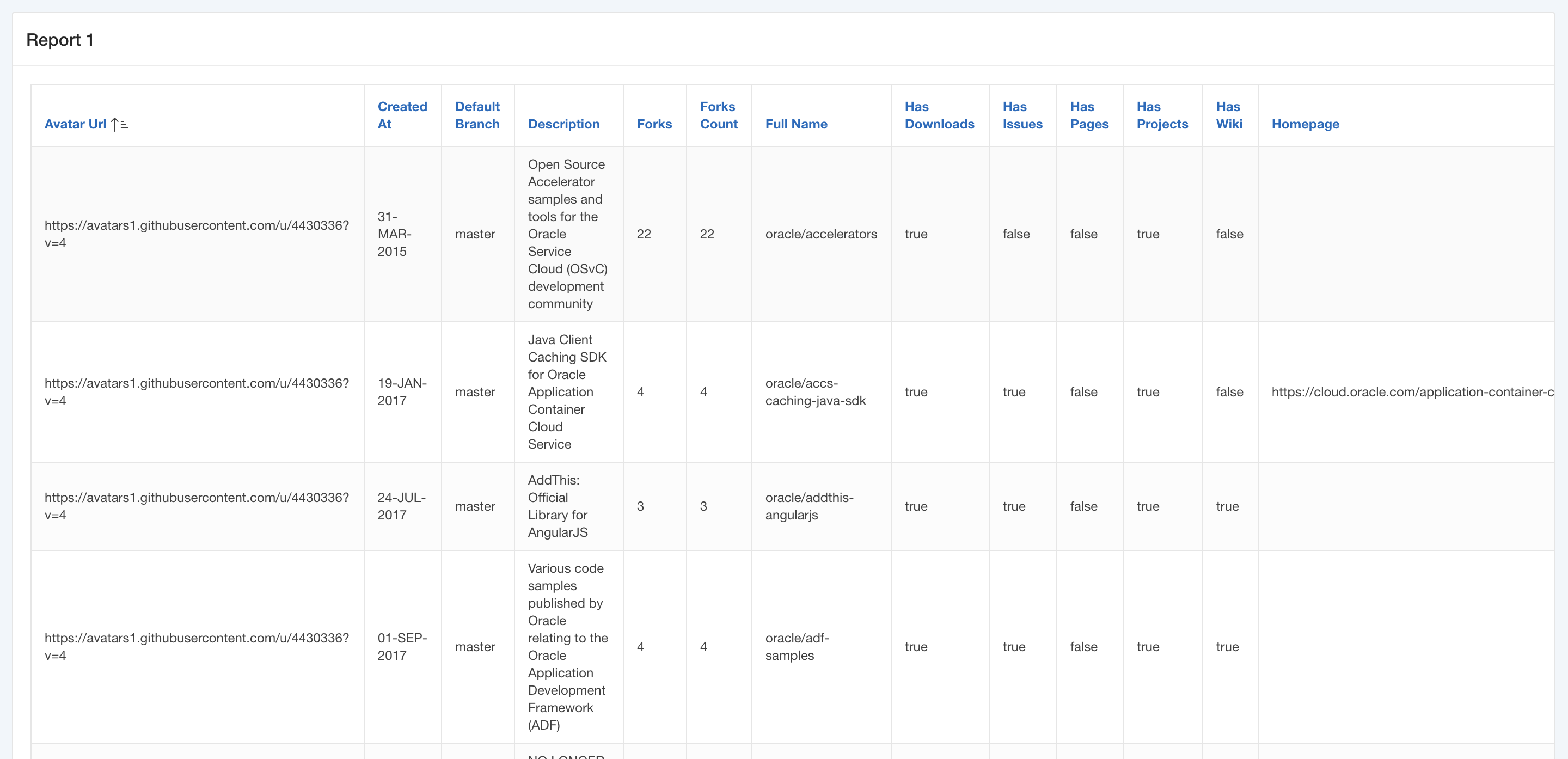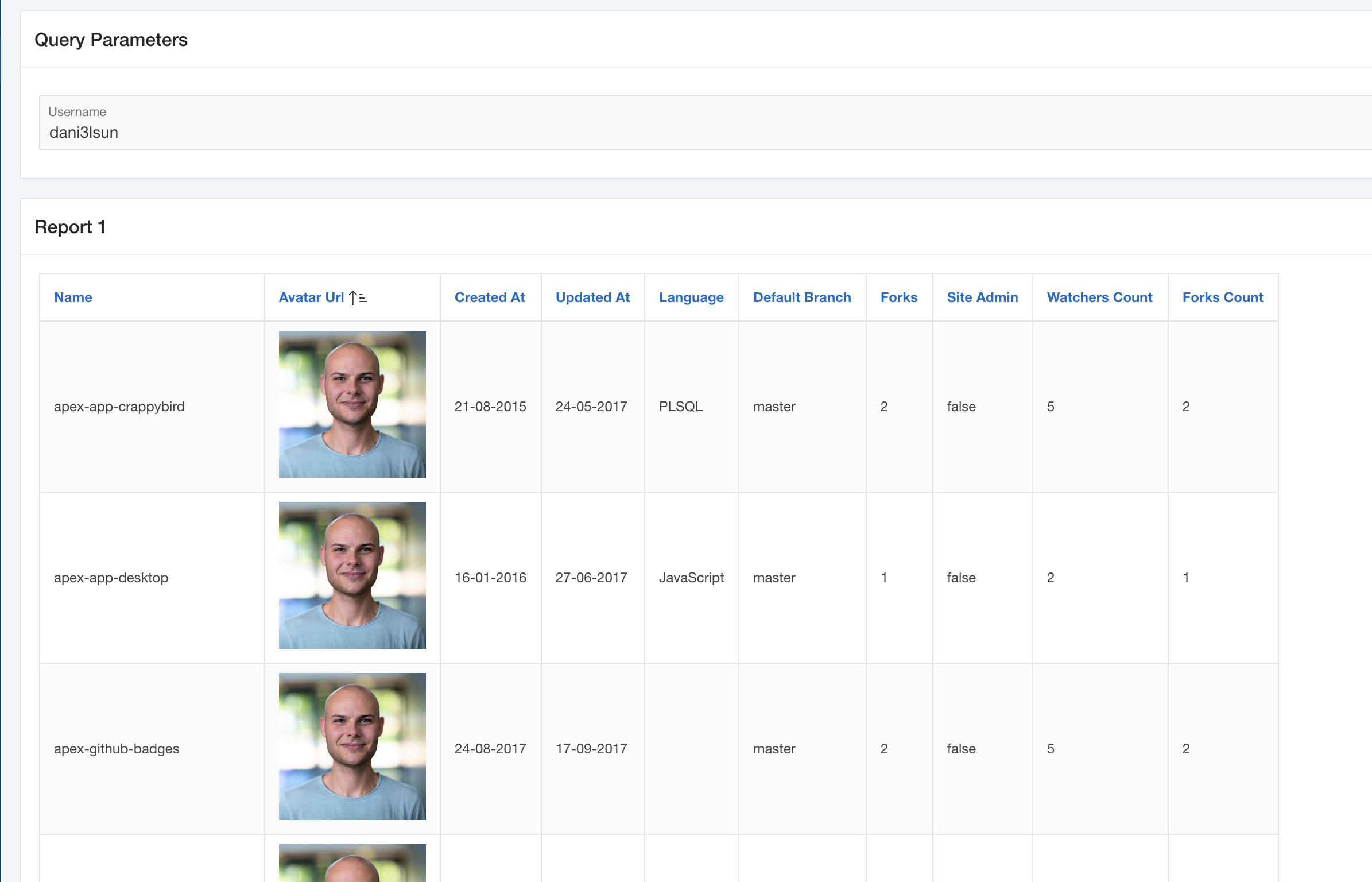 Time to adjust the layout of this report a bit. The AVATAR_URL is pointing to an avatar image of the repository owner. So, in Page Designer, navigate to that column and simple apply the <img> tag using the HTML Expression attribute.
