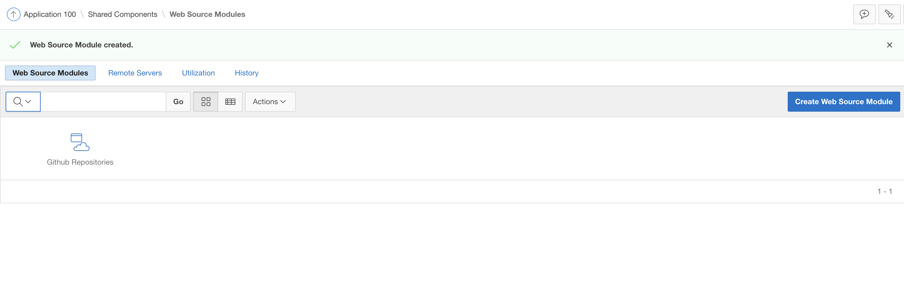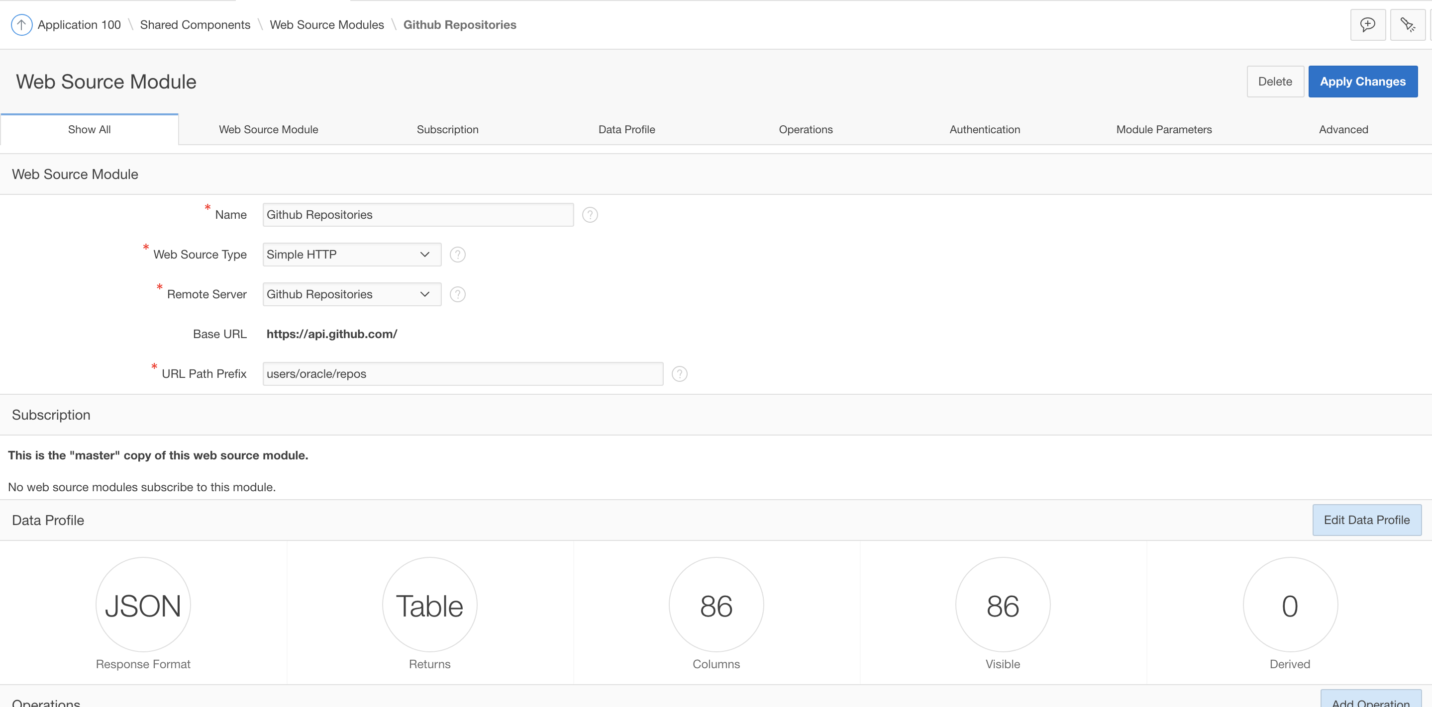 For that, we first need to add a Web Source Parameter to the meta data in Shared Components. Thus navigate to Web Source Modules within Shared Components and then to the details of the Github Repositories module.