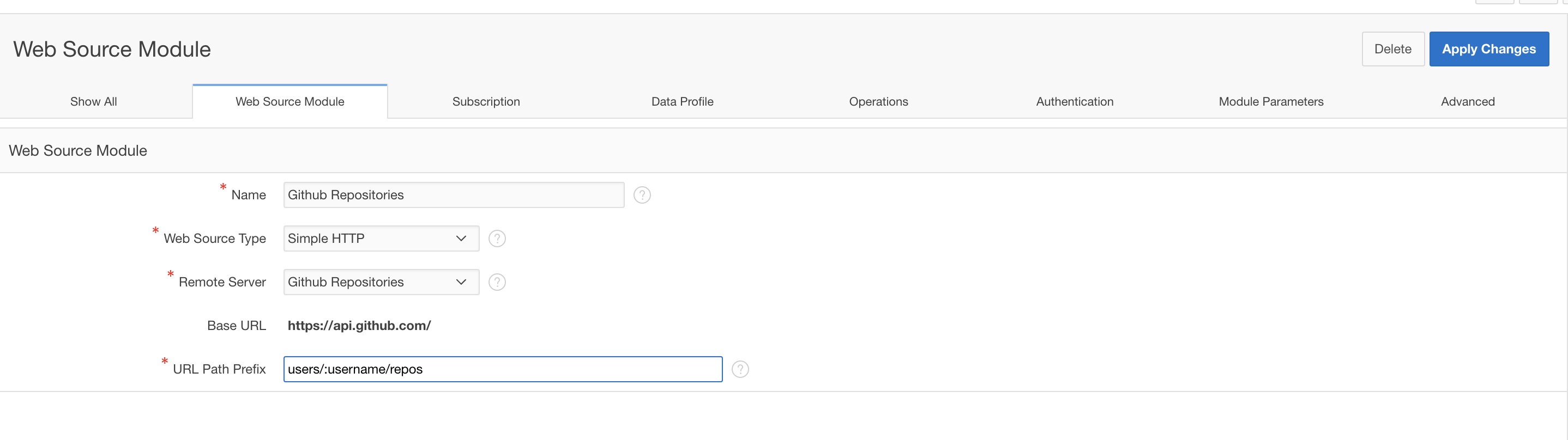 Next, we have to change the URL endpoint of the Web Source Module in order to pick up the parameter. Click on the Web Source Module tab (this contains general information). Then change the URL Path Prefix of the Web Source Module from users/oracle/repos to users/:username/repos.