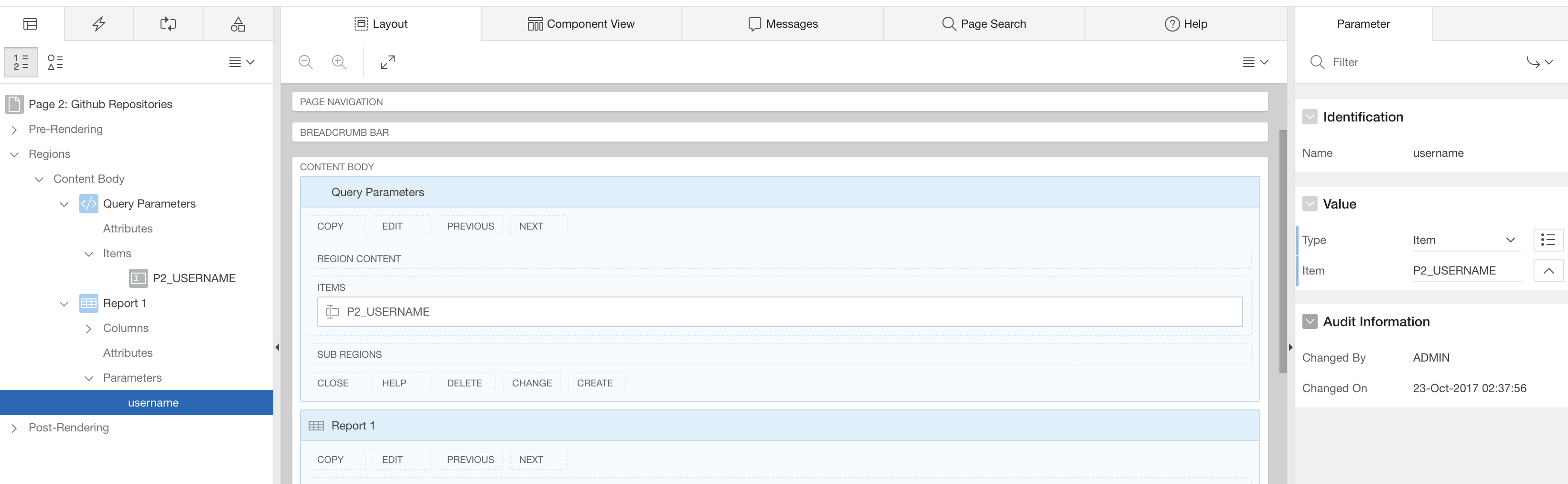 Then review the Classic Report node in the tree on the left again. It now has an additional Parameters child node; there you’ll find the username parameter you have configured. It still uses the default value configured in Shared Components. Change it to use the text field Item.