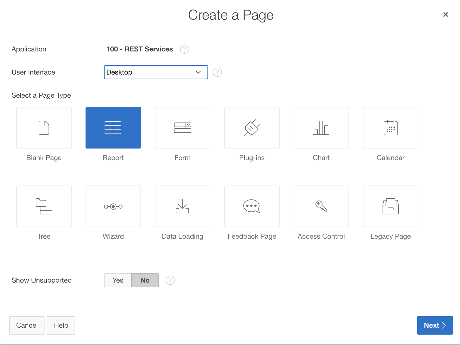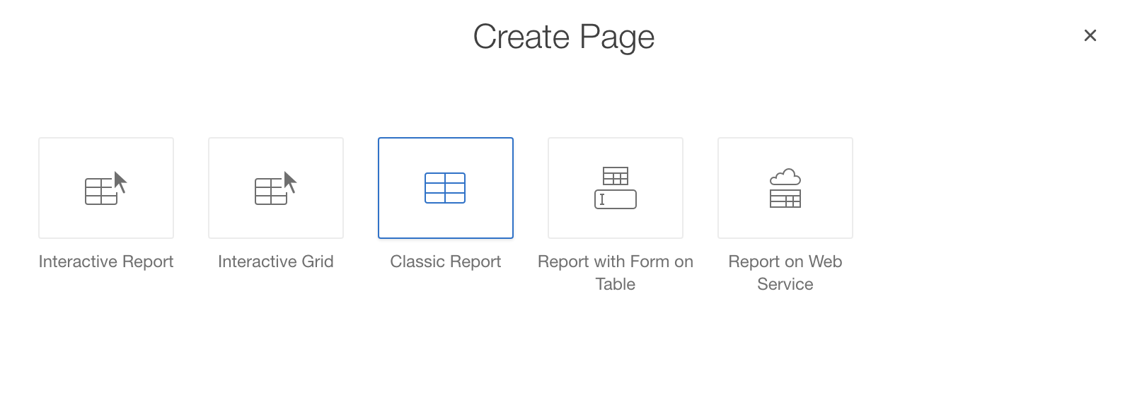 Next, we are about to use the new Web Source Module within an APEX component. Navigate to the application pages and click the Create Page button in order to add a new page. Choose a Report page and use the Classic Report implementation (Application Express 5.2 will support Classic and Interactive Reports based on Web Source Modules).