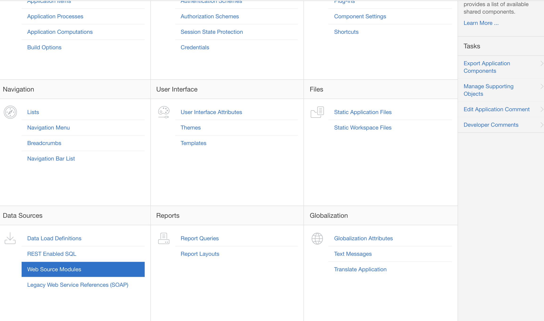 The following steps explain how to achieve this. To begin, create your workspace on apexea.oracle.com (if not already done) and log in. Then create a simple application with just one home page (accept the defaults in the new Create Application wizard). One the application has been created, navigate to Shared Components and look for Web Source Modules into the lower left corner.