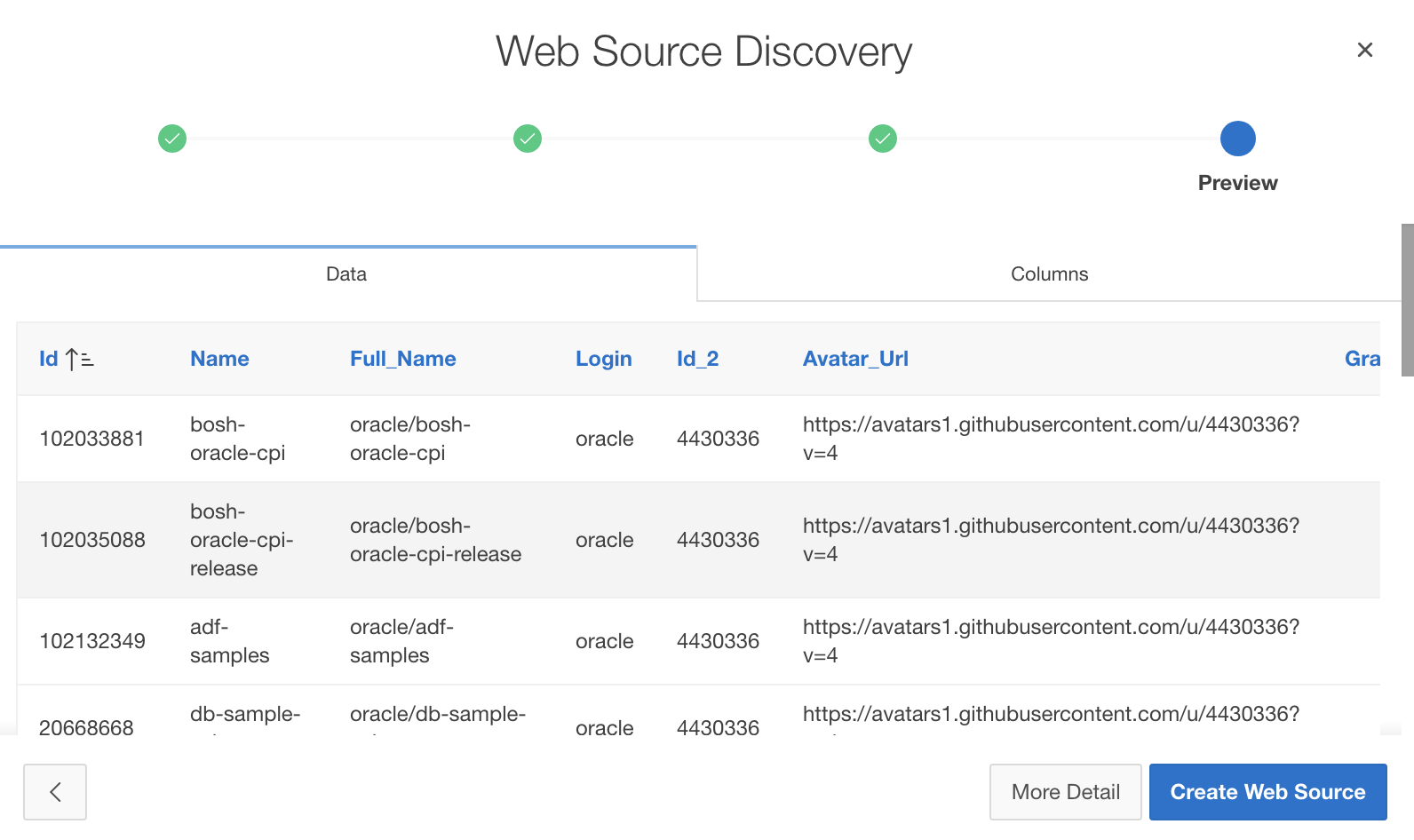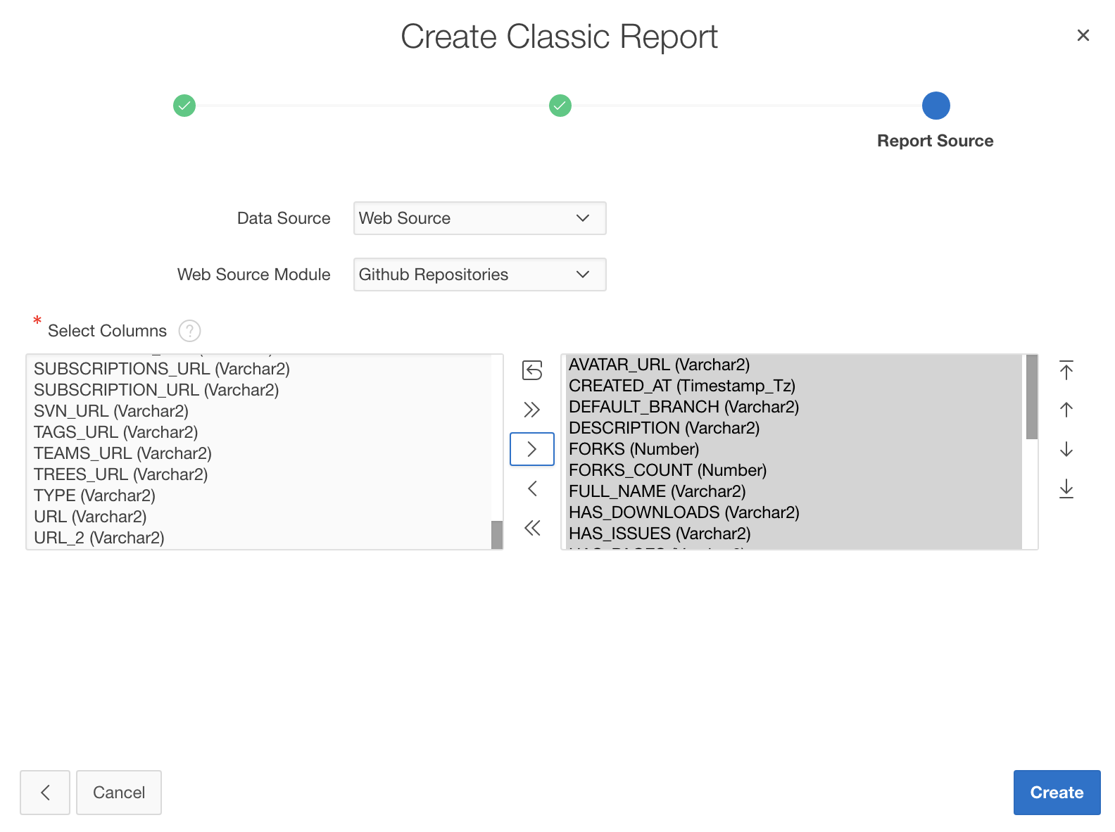 Choose Web Source and pick Github Repositories in the second Web Source Module select list. Then the Columns shuttle will populate with about 90 columns (the Github REST API returns a lot of attributes). Choose an interesting selection; make sure to add at least, but not only the ID, NAME, CREATED_AT, UPDATED_AT and AVATAR_URL columns to your report. When finished, click Create.