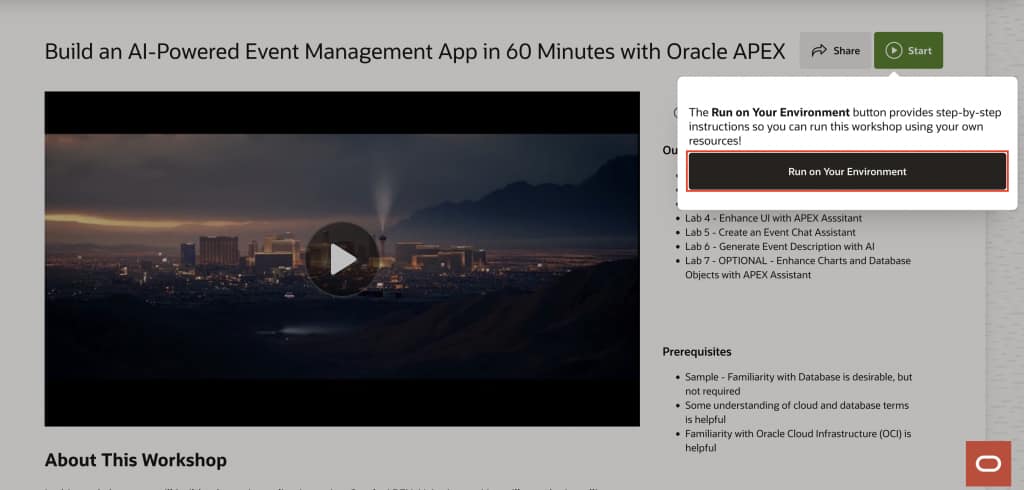 This Live Lab offers a comprehensive walkthrough of how Generative AI is transforming application development with Oracle APEX. By the end of the lab, you will not only have a fully functional Events Management application, you will gain hands-on experience in using Generative AI within Oracle APEX to design, build, and enhance applications with greater speed and precision. Here’s what you will accomplish in this LiveLab: