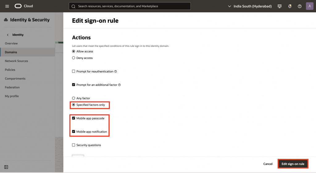 16. Under Actions, select Specifies factors only and enable Mobile app passcode( this also enable Mobile app notification), then click Edit sign-on rule.