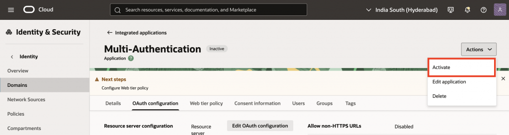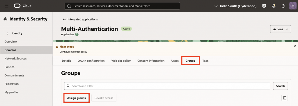 13. When activated, by default the application allows access to all users in the identity domain, this may be your intent for the integration; however, you may also want to restrict which users can sign in to that specific application. Follow these steps to restrict access.