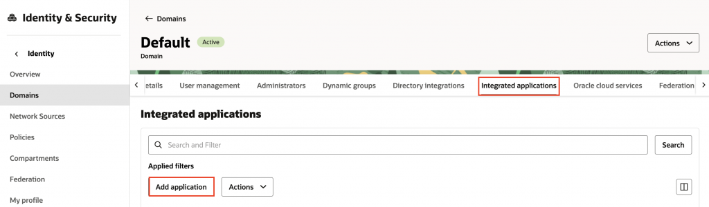 1. Log in to your Oracle Cloud Console, click on the hamburger menu on the top left corner of the screen and access Identity and Security → Domains and select the Default domain from the list shown.