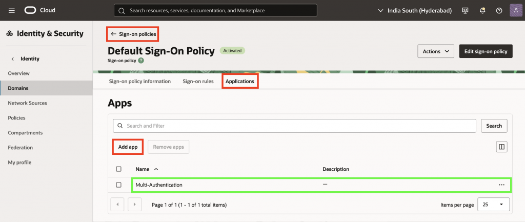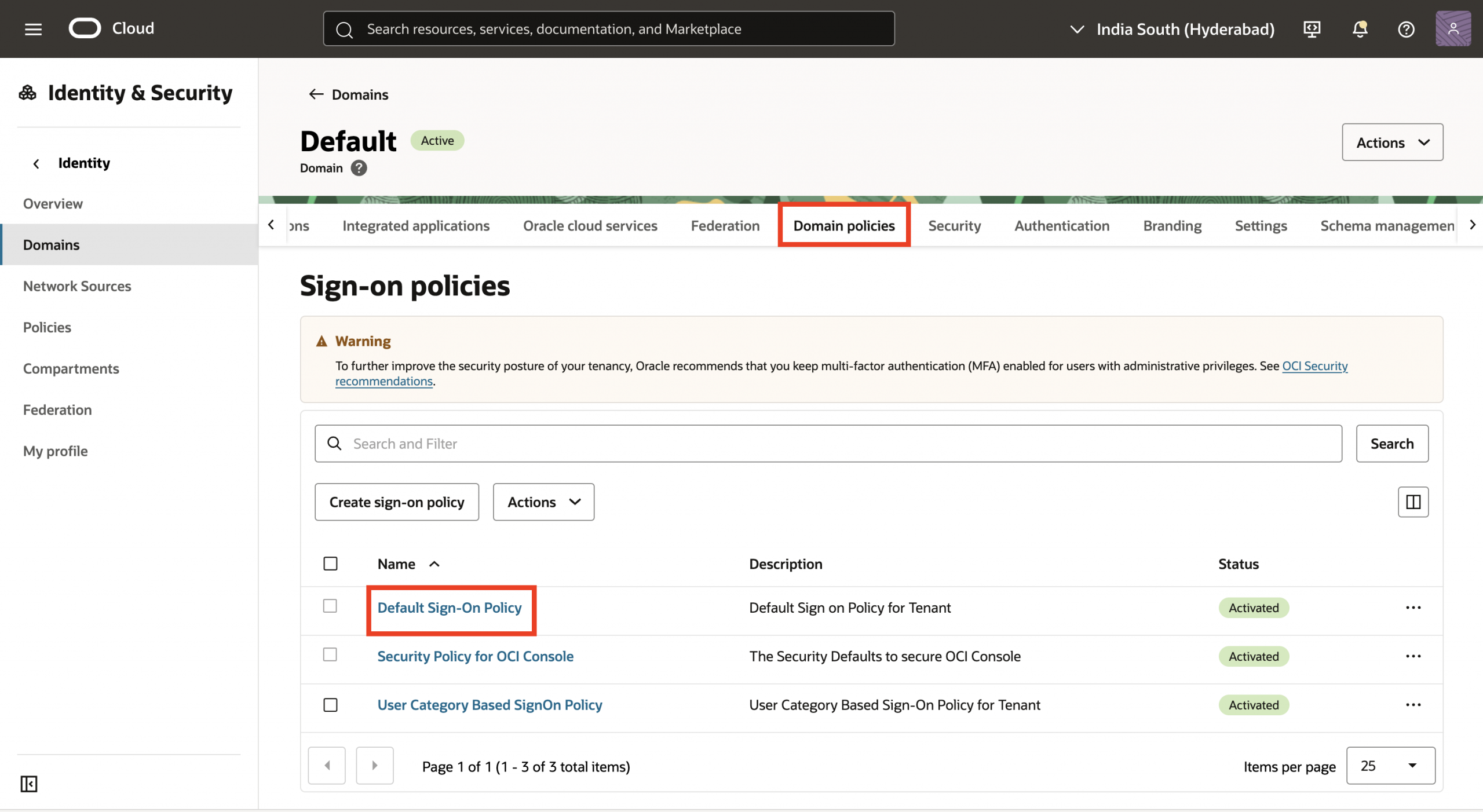 14. Navigate back to the Default Domain. To enable multi factor authentication, click Domain policies and select Default Sign-On Policy.